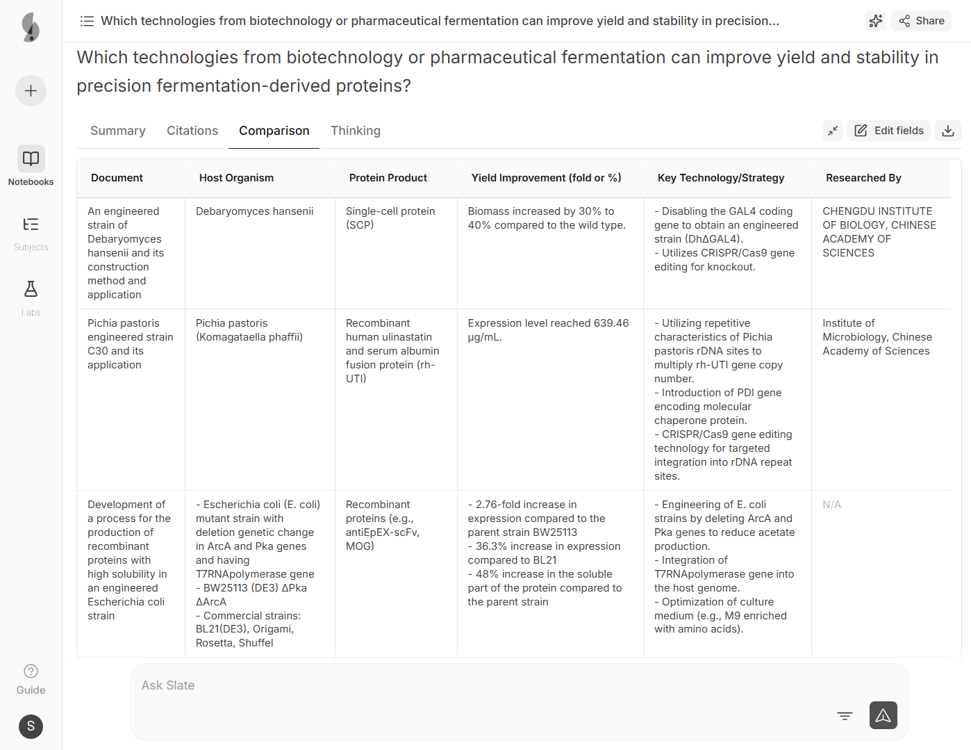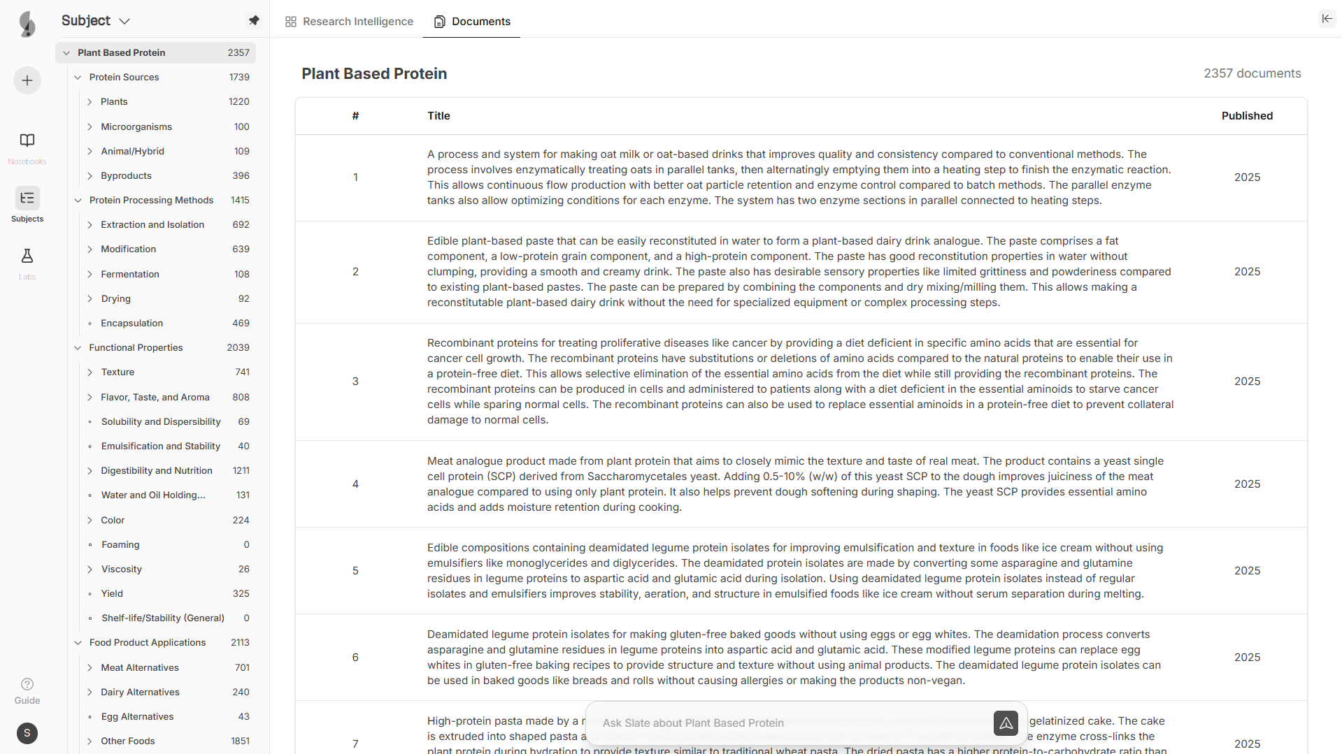 Slate understands alternate protein terminology and uncovers innovations hidden across millions of patents and research papers
