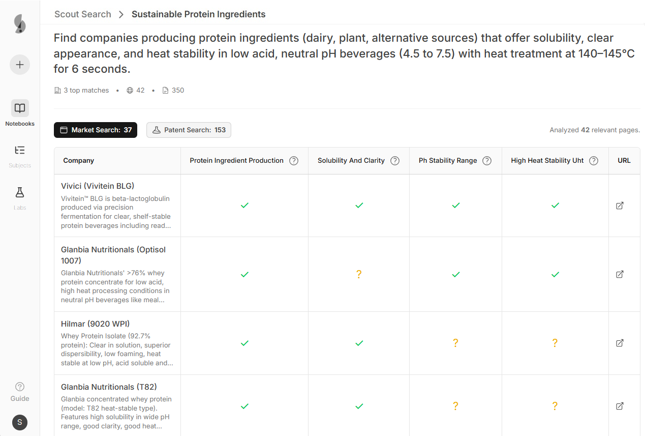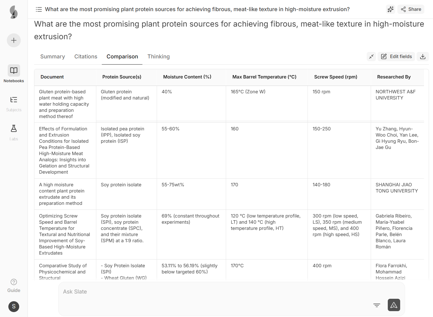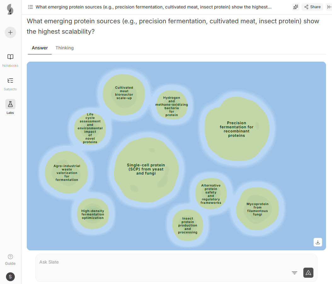 Slate uncovered underutilized protein-hydrocolloid synergies and high-moisture extrusion parameters validated in patents from biotech and food science labs globally. The team discovered a novel mycoprotein-pea protein hybrid approach from a European university study.