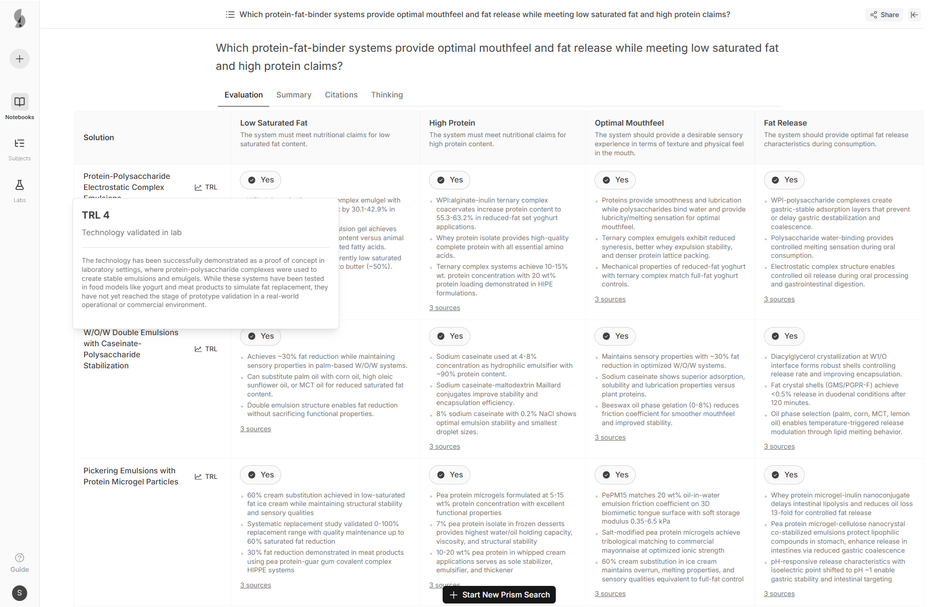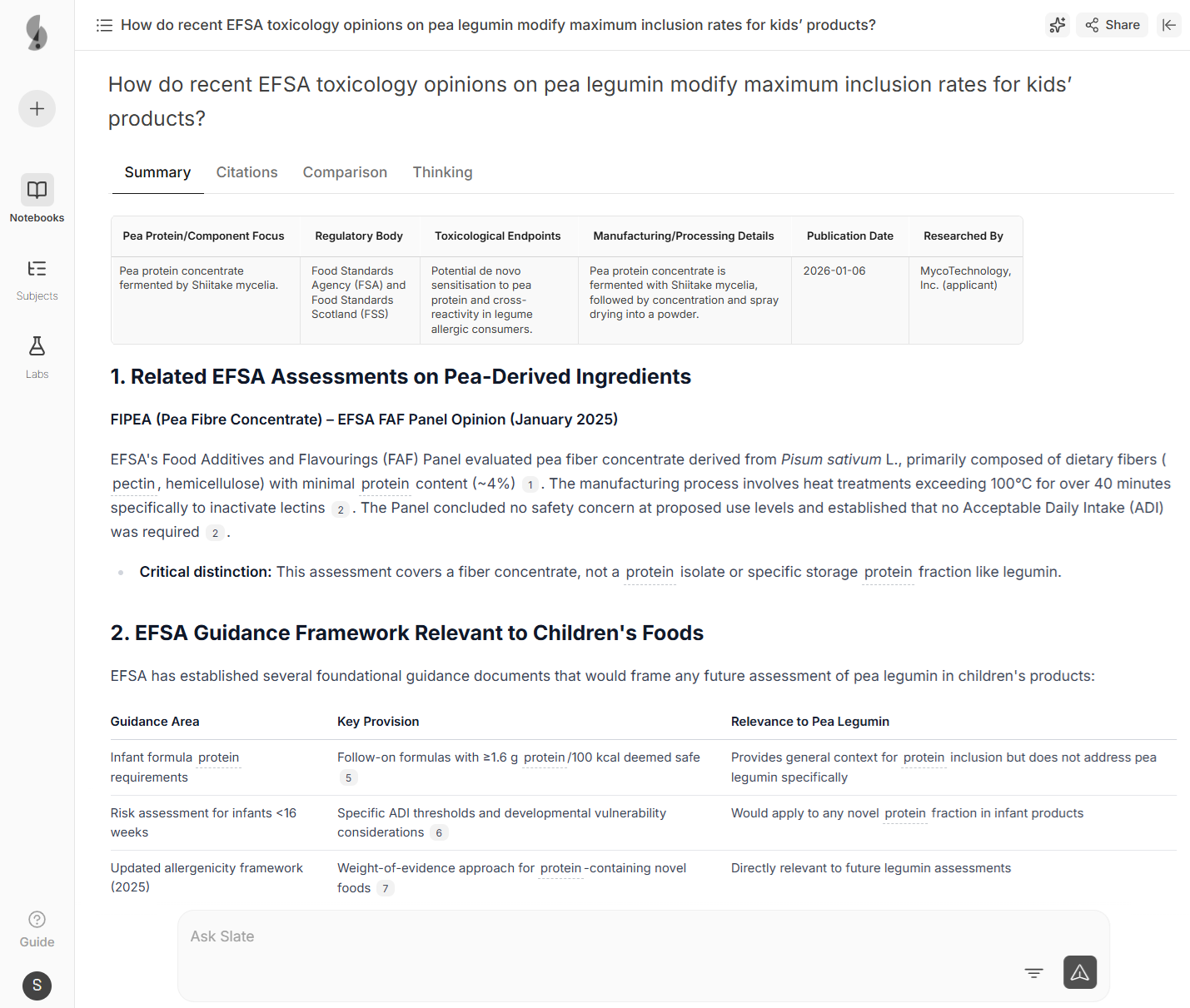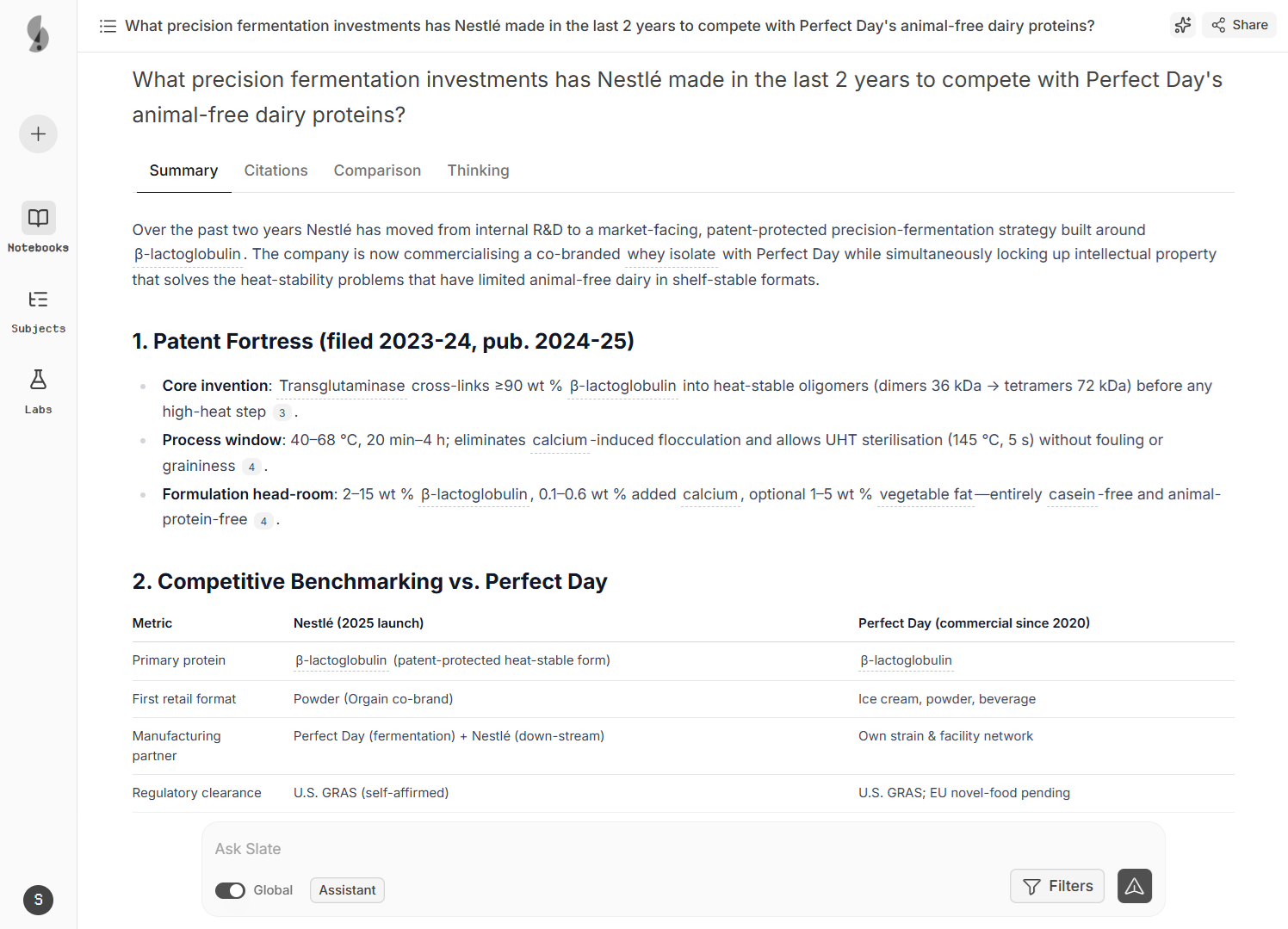 Slate surfaced cross-industry purification techniques from pharmaceutical bioprocessing, mapped the complete regulatory landscape for fermentation-derived proteins, and identified 8 precedent Novel Food approvals with comparable safety profiles.