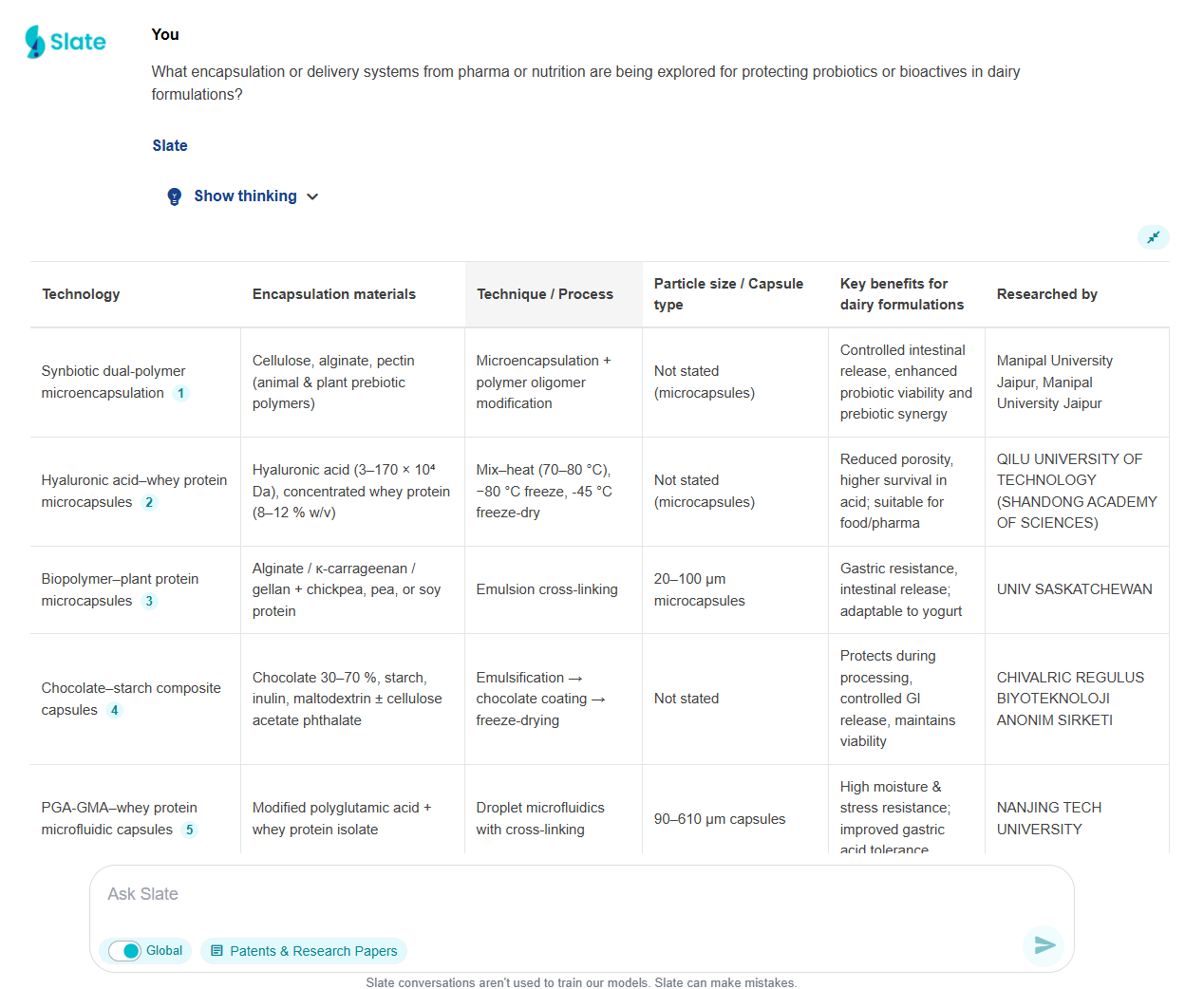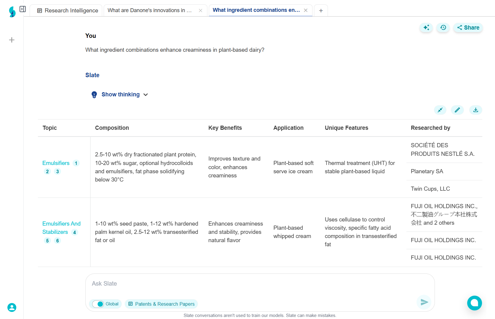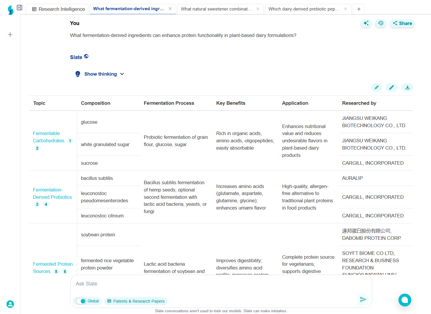 Used Slate to discover 12 novel texture-enhancing technologies, including a proprietary fermentation process from a Danish startup and new protein modification techniques from academic research
