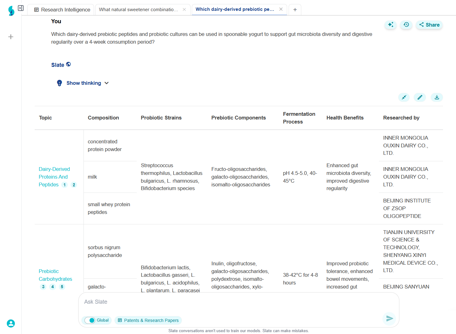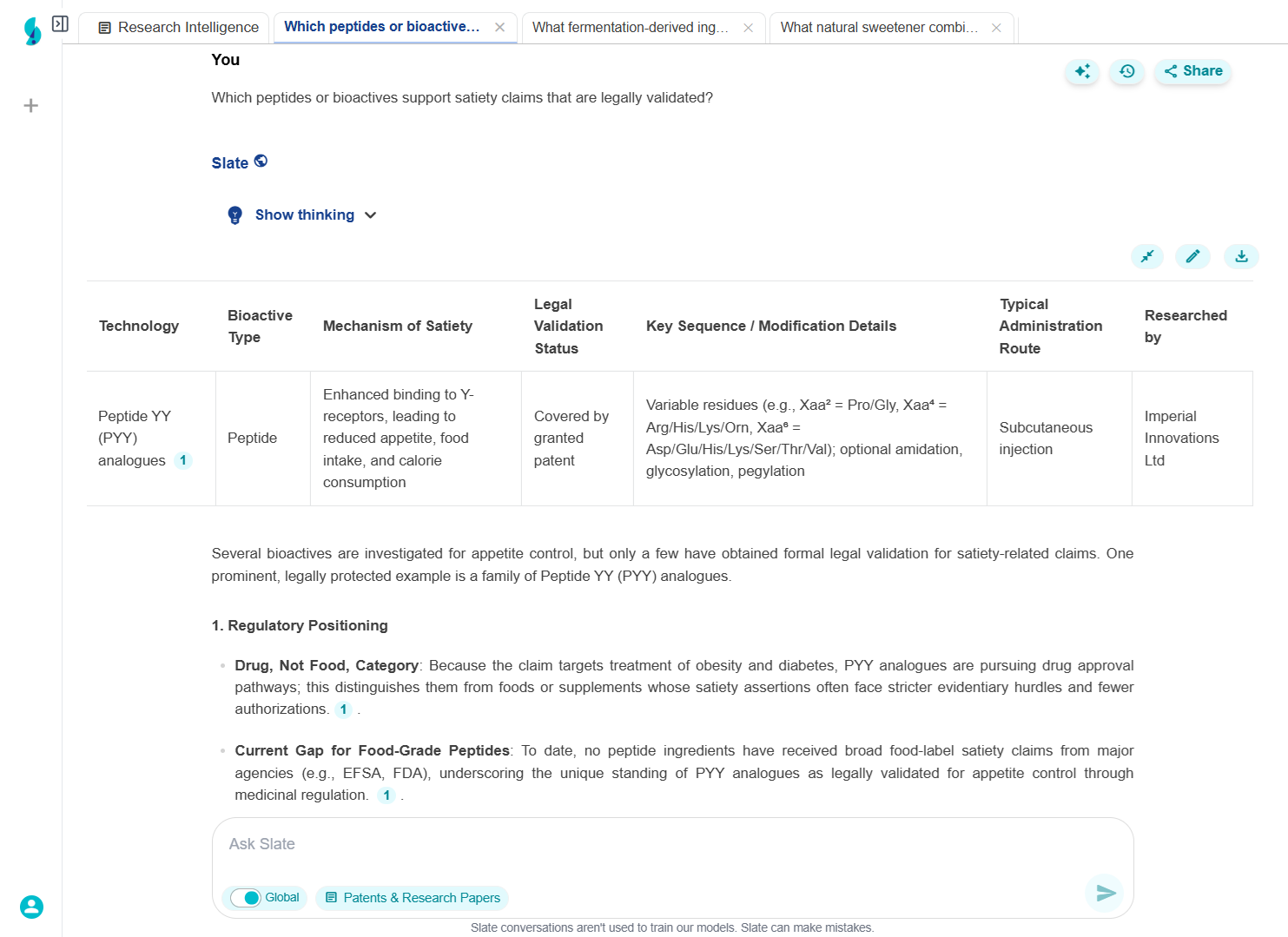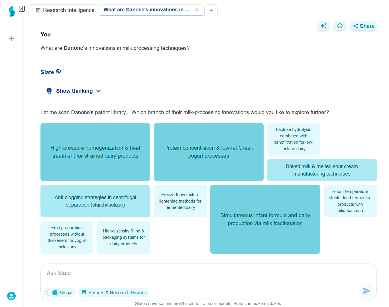 Used Slate to discover 12 novel texture-enhancing technologies, including a proprietary fermentation process from a Danish startup and new protein modification techniques from academic research