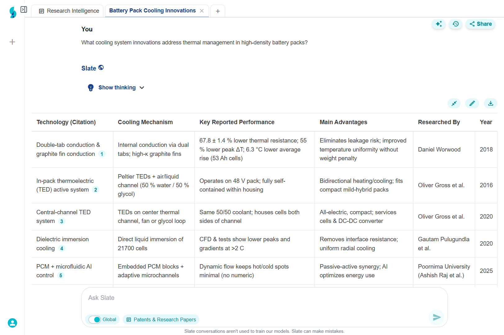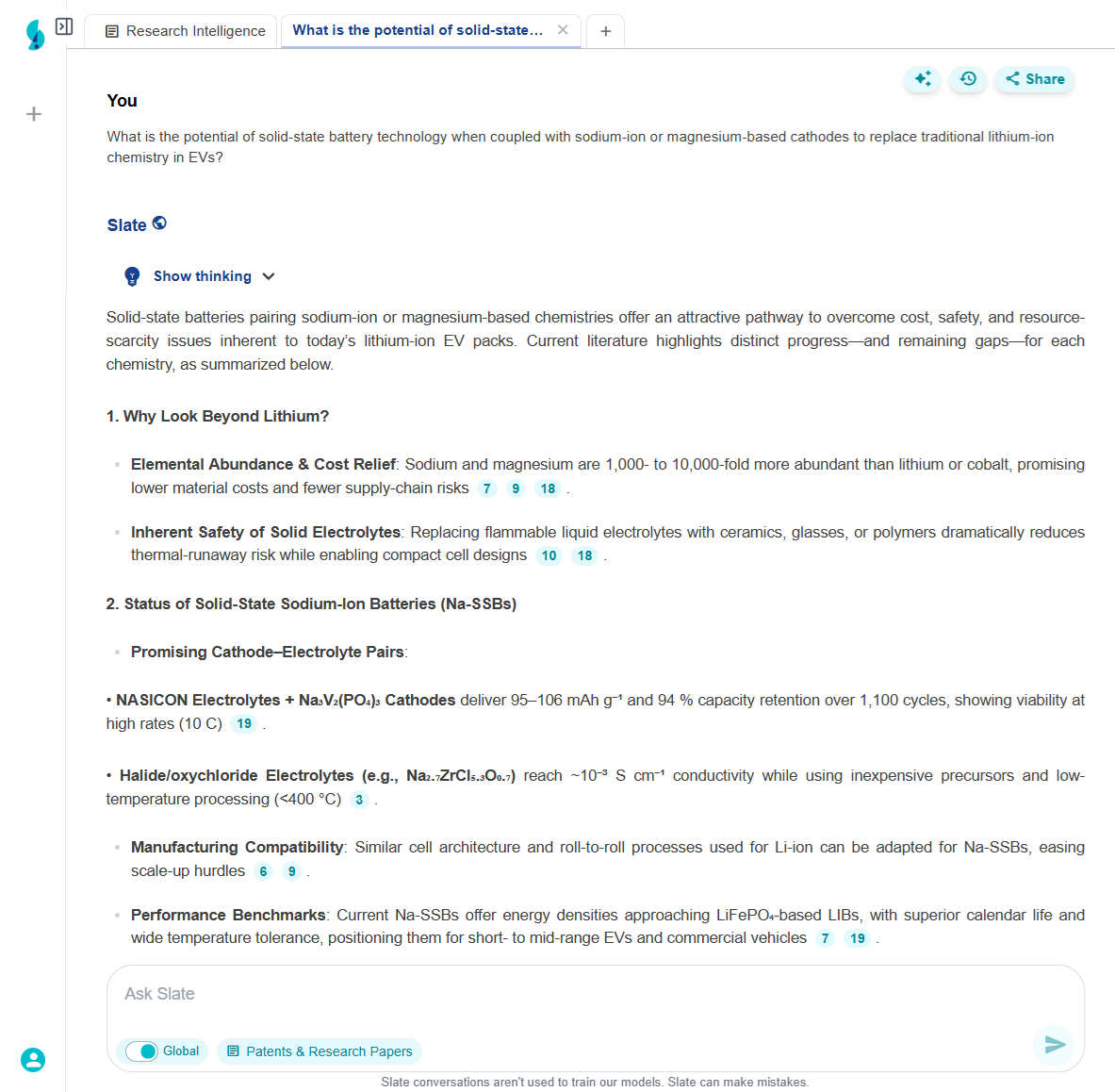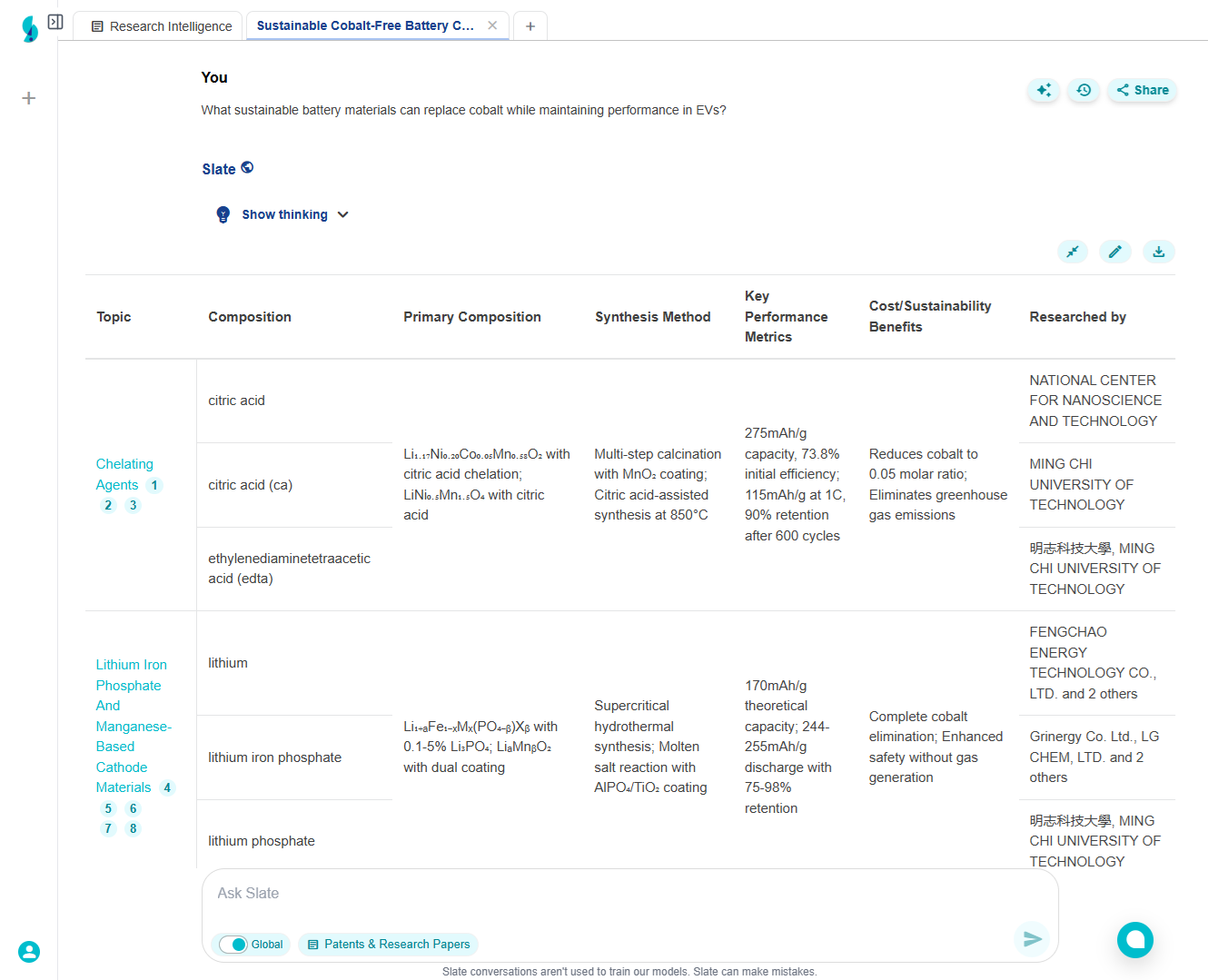 Used Slate to identify 14 viable cathode materials from global research, including breakthrough lithium-iron-phosphate patents