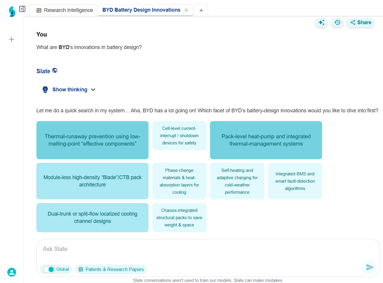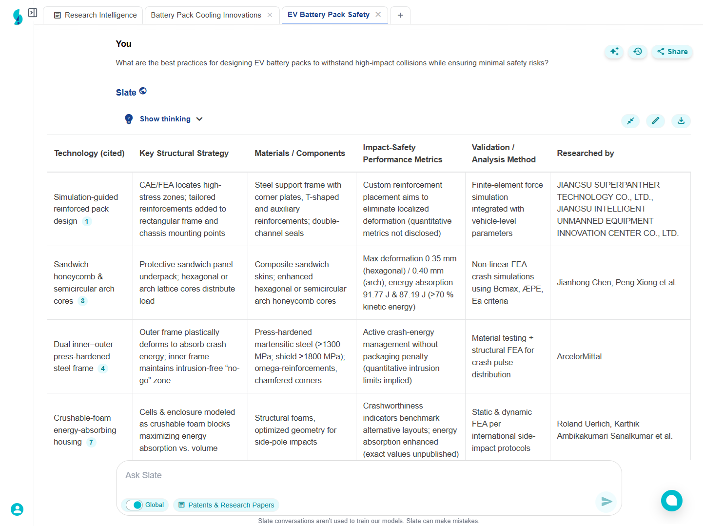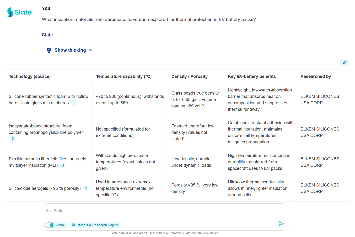Used Slate to identify 14 viable cathode materials from global research, including breakthrough lithium-iron-phosphate patents
