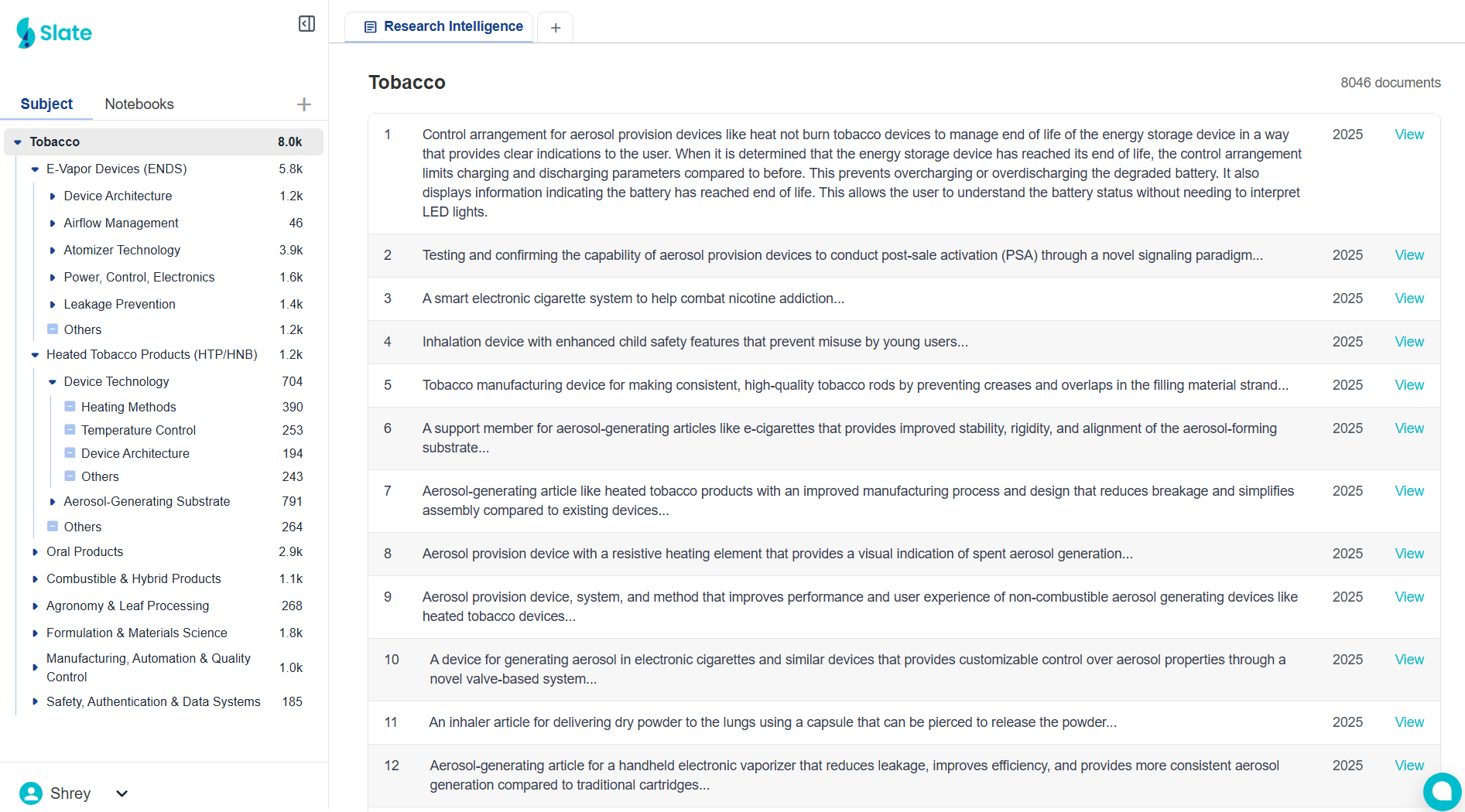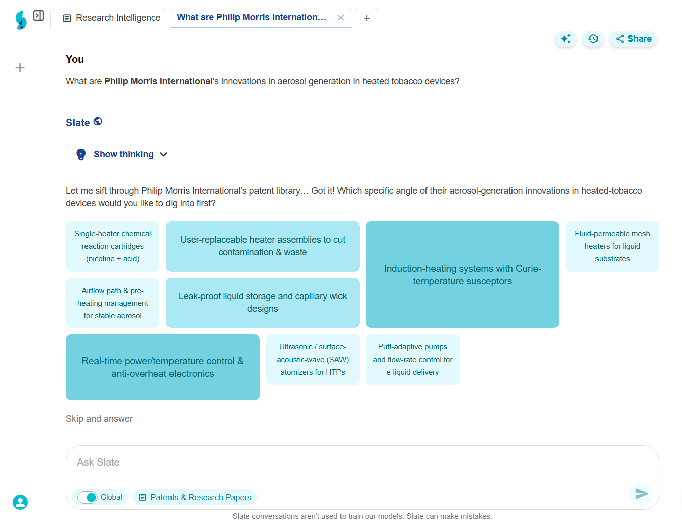 Slate helps you track patent filings, product launches, and research directions of PMI, BAT, JTI, and others, so you can spot white spaces, prioritize the right innovations, and accelerate your product pipeline with confidence.