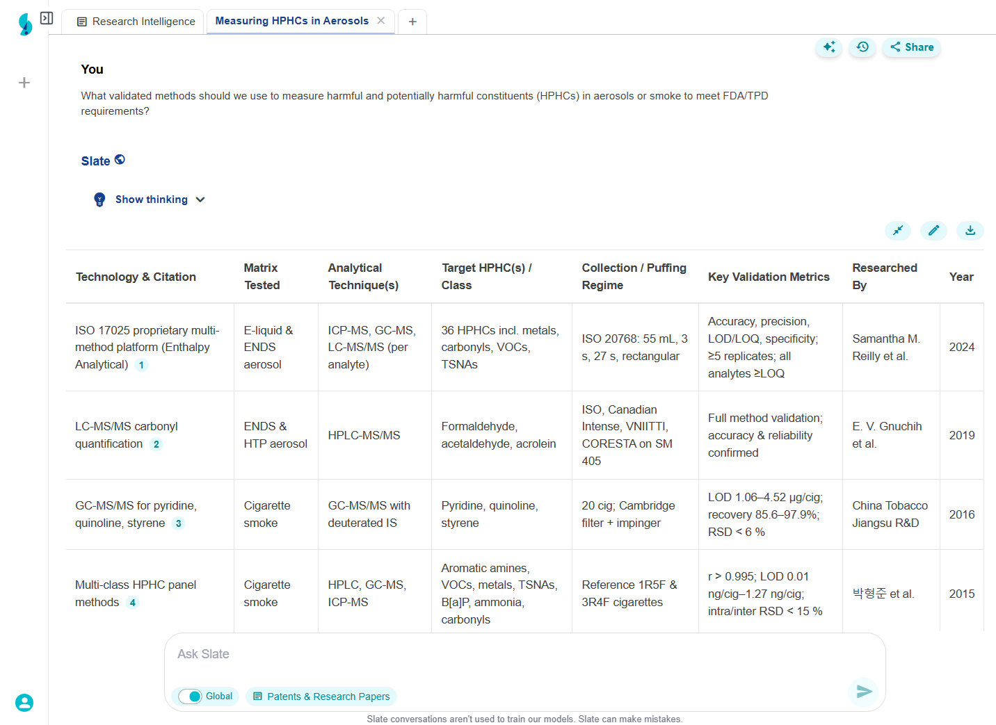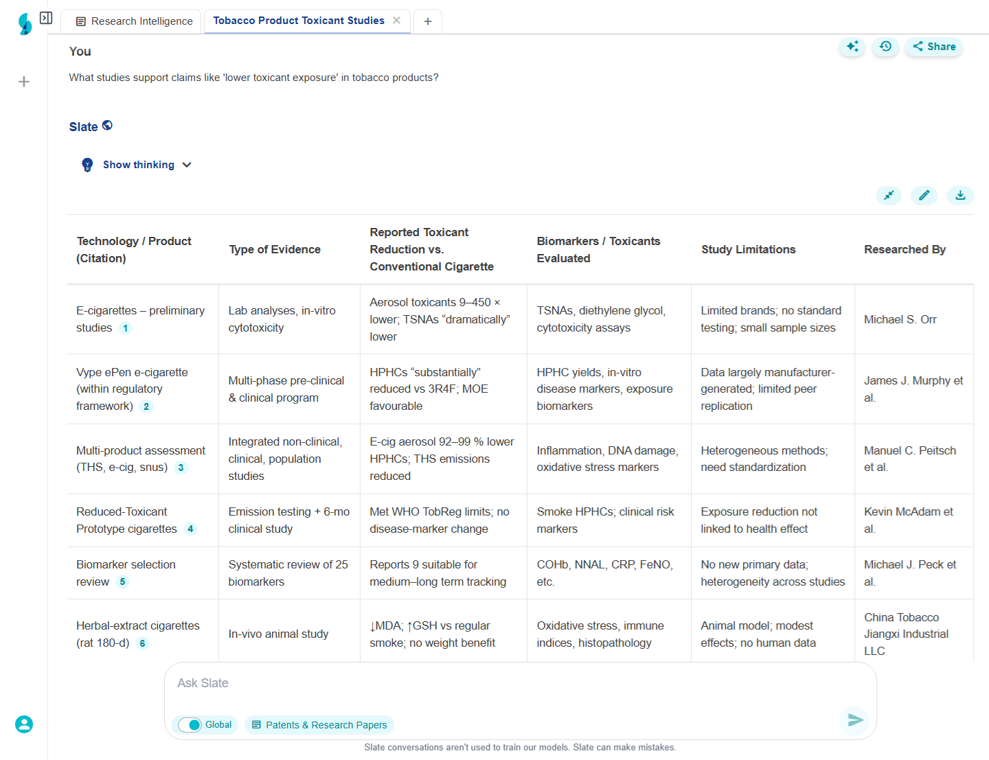 Slate provides real-time FDA, EU, and APAC tobacco regulation updates along with scientific evidence to support your dossiers. Find alternative technologies and materials with defensible safety claims, keeping your R&D compliant and products moving to market.