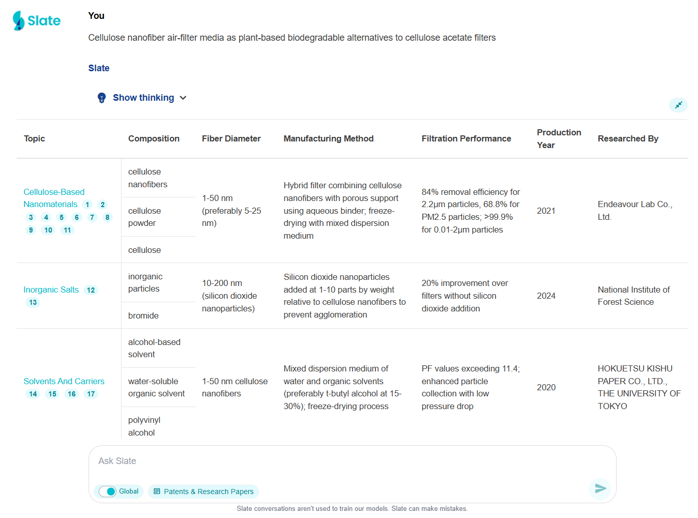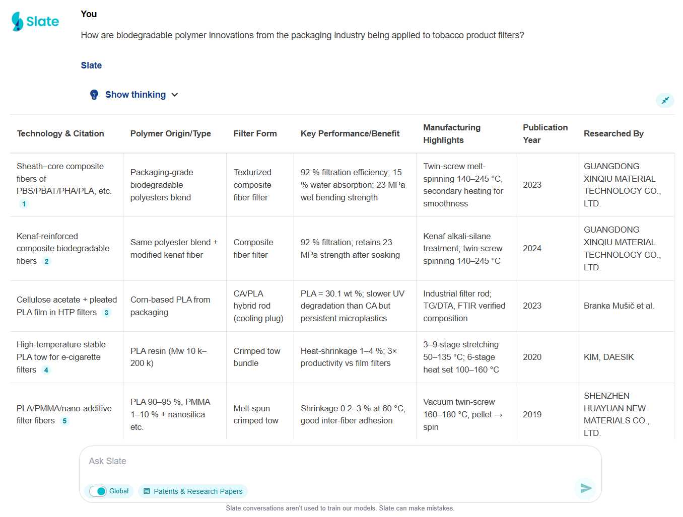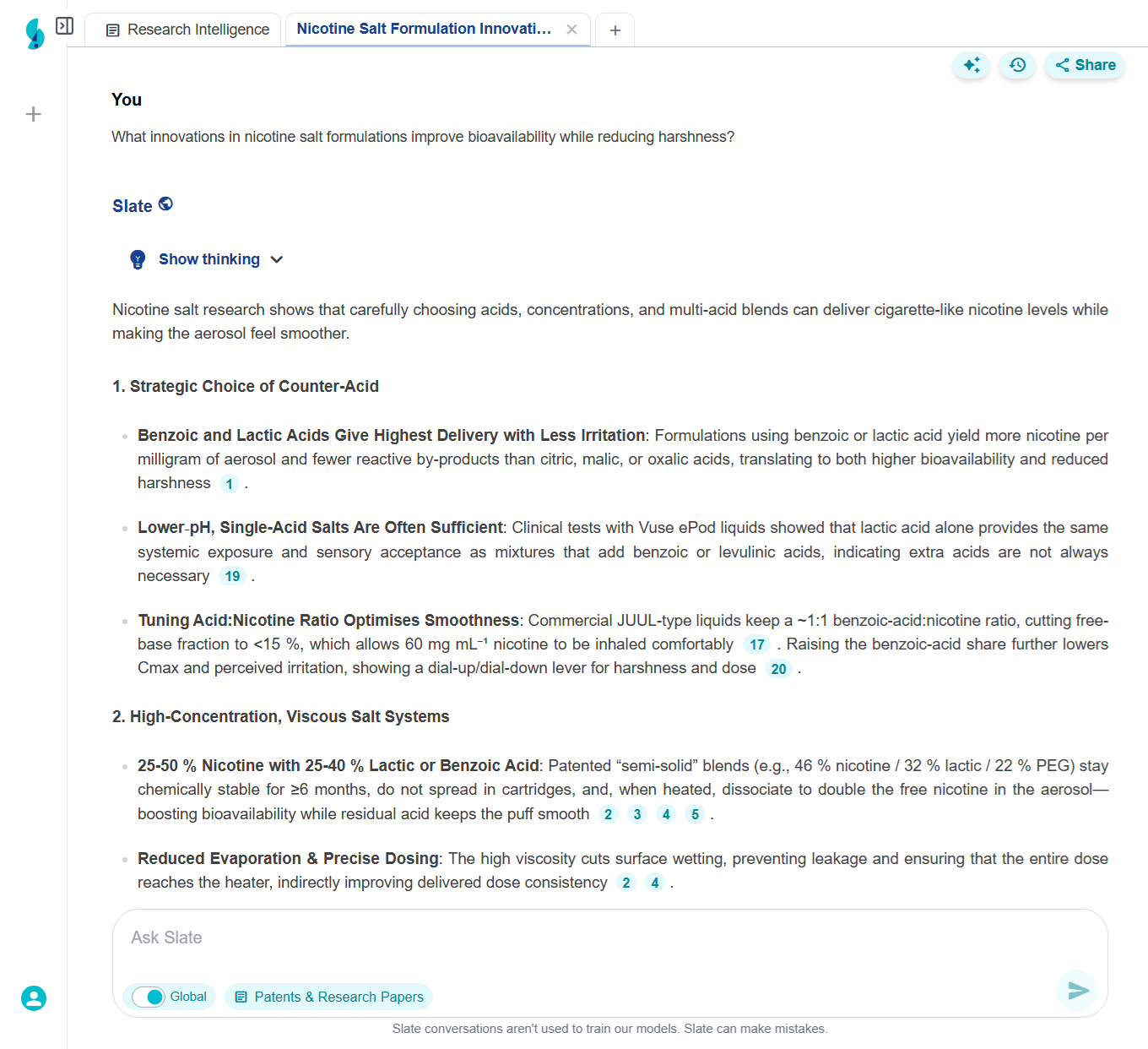 Slate helps you uncover safe flavoring compounds, biodegradable filters, and nicotine substitutes with validated performance from global research.