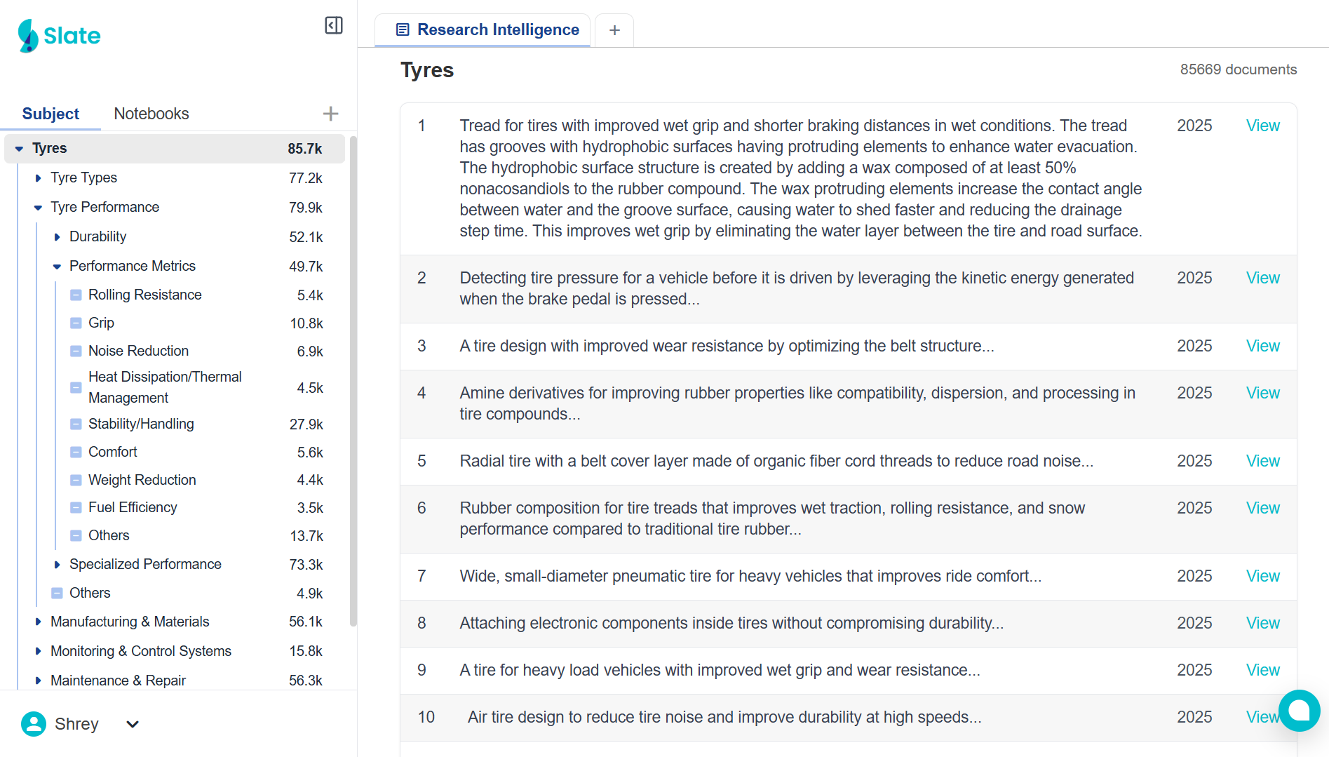 Slate organizes 450M+ scientific literature in a structured taxonomy, summarizing and categorizing for quick access to data on tyre materials, types, performance, durability, and manufacturing.