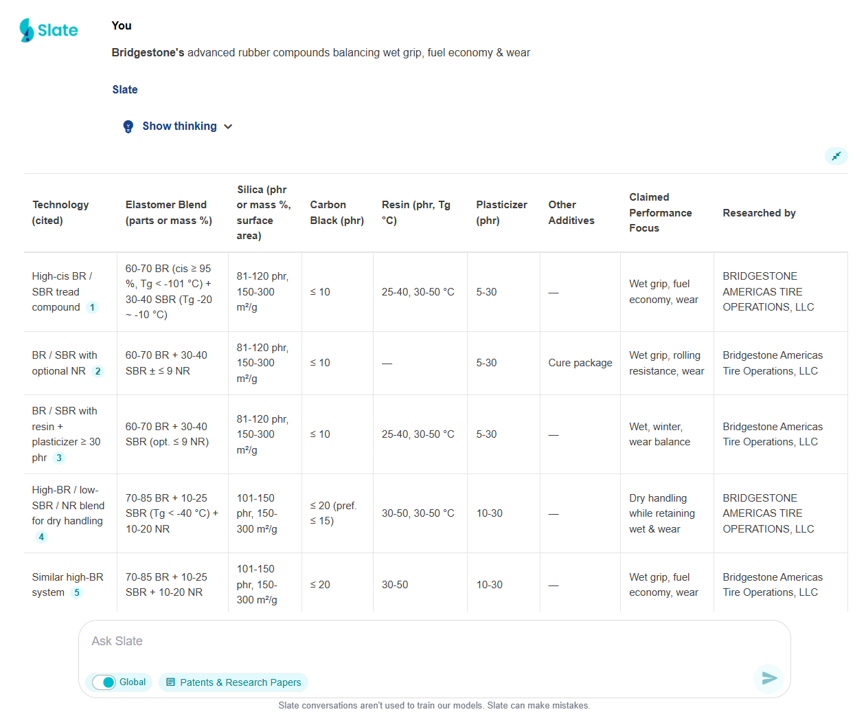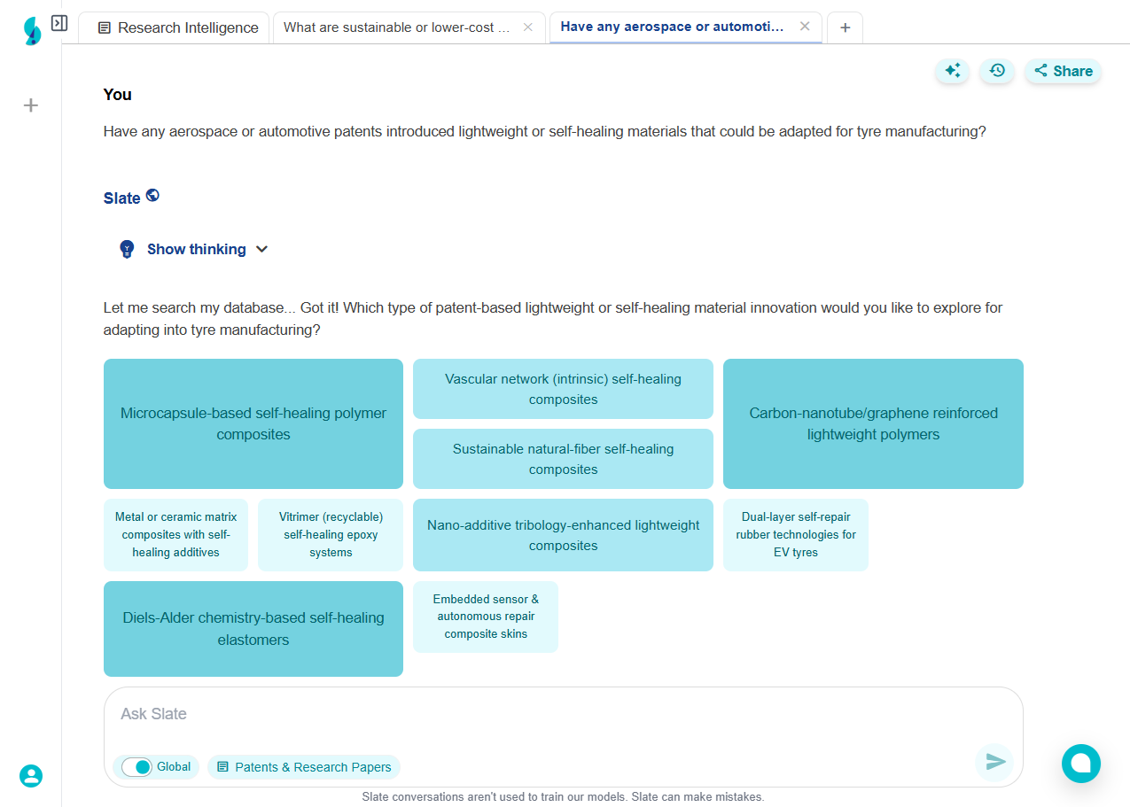 Explore innovations from aerospace, biotech, and packaging that can enhance tread wear, rolling resistance, or sustainability. Slate connects dots across industries so you don’t have to reinvent the wheel.