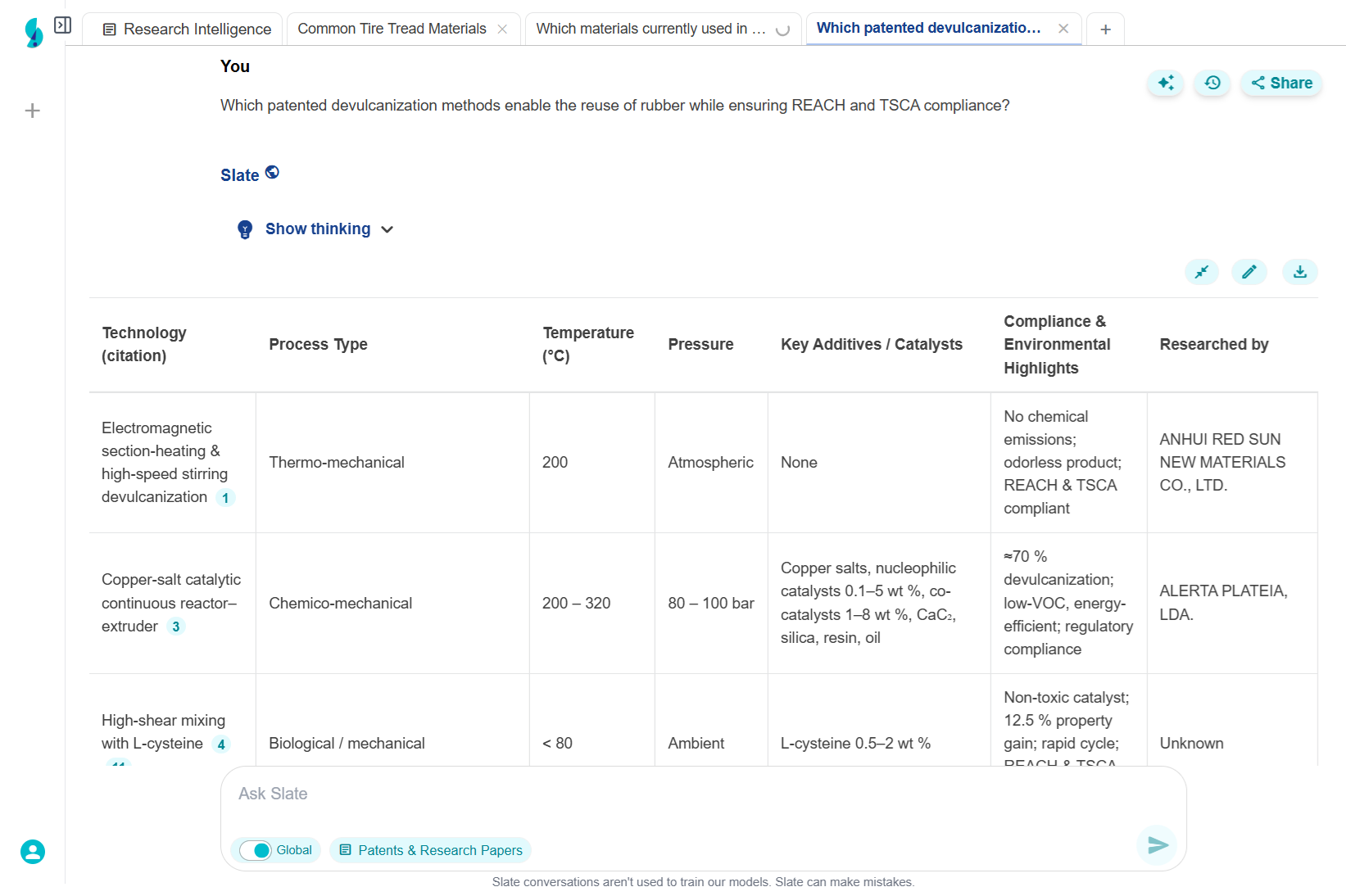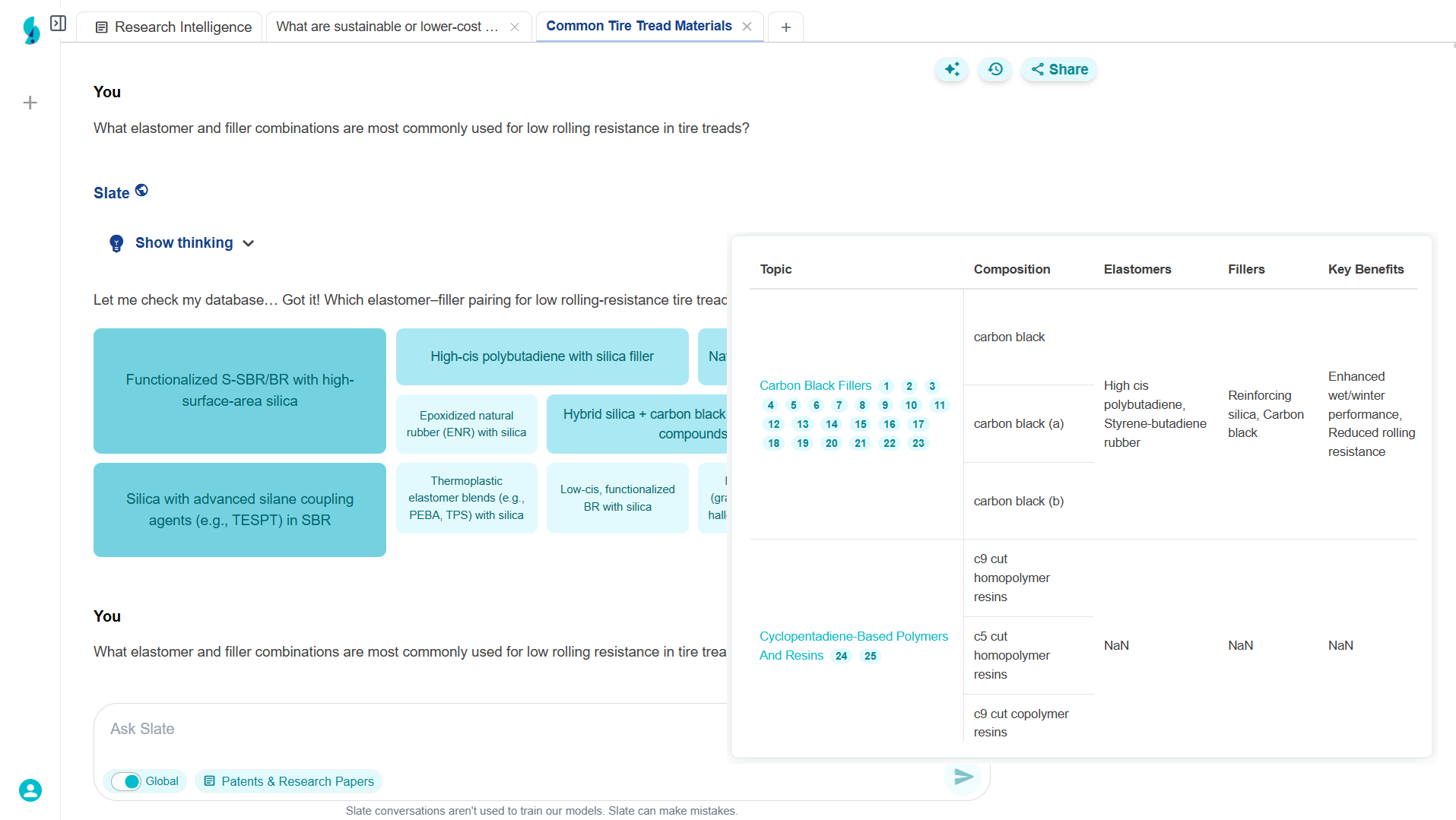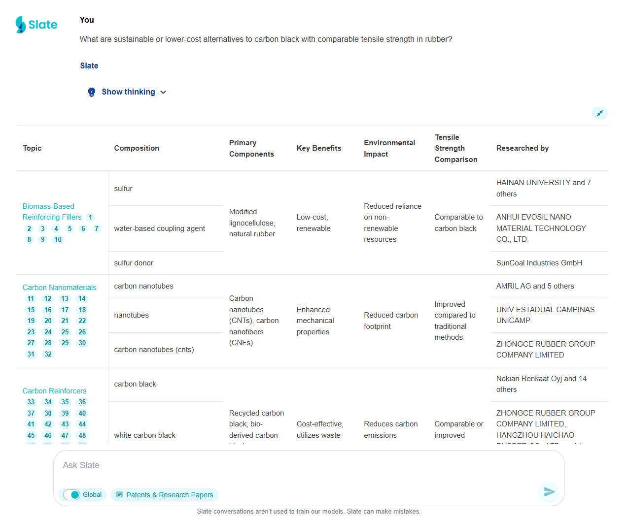 Slate helps you identify and validate plant-based compounds, fillers, and additives (like guayule, silica from rice husks, lignin) with proven performance metrics, cutting months of lab scouting and supplier outreach.